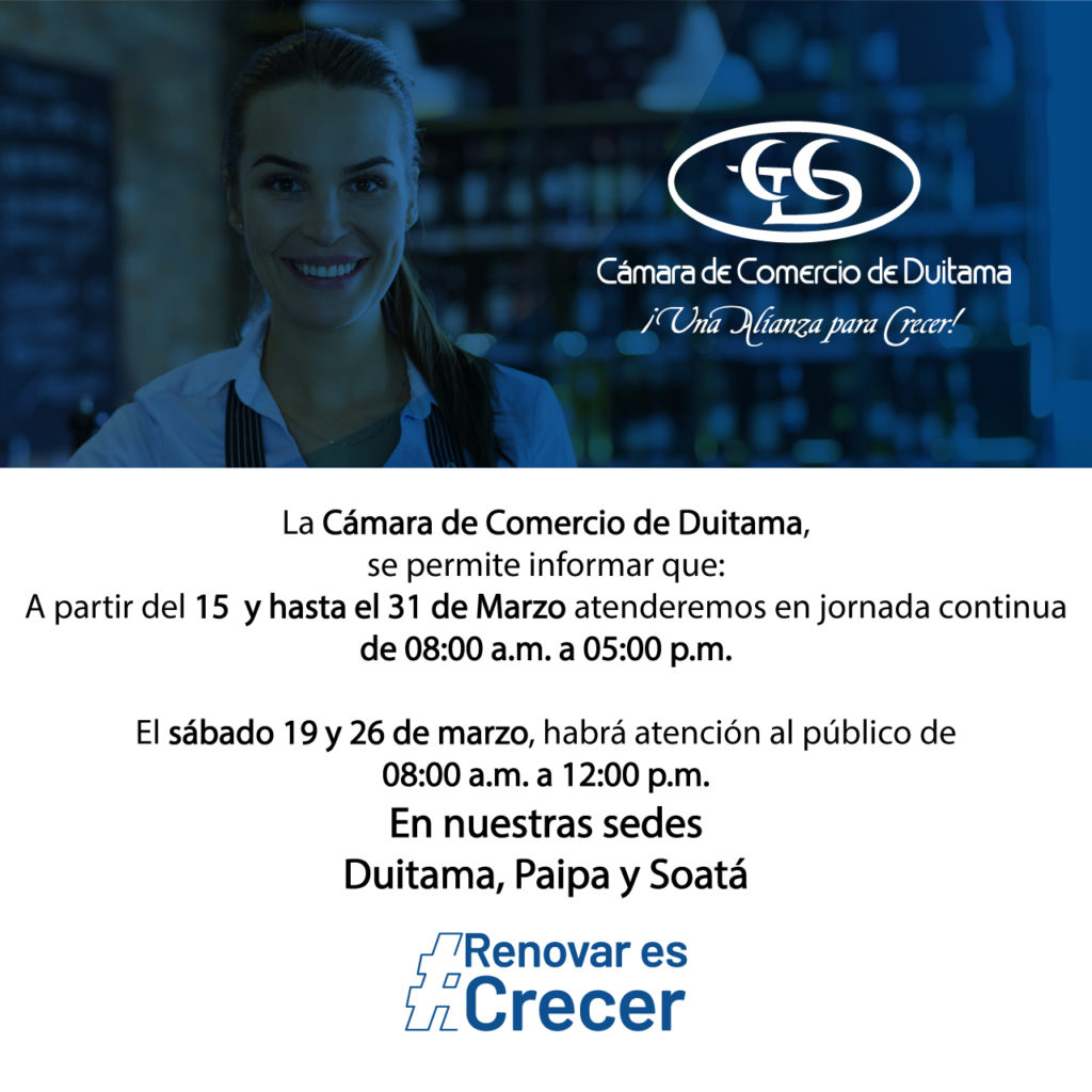 #Atención | La Cámara de Comercio de Duitama se permite informar que a partir del 15 y hasta el 31 de marzo atenderemos en jornada continua de 8 am a 5 pm El sábado 19 y 26 de marzo, habrá atención al público de 8 am a 12 m en nuestras sedes Duitama, Paipa […]