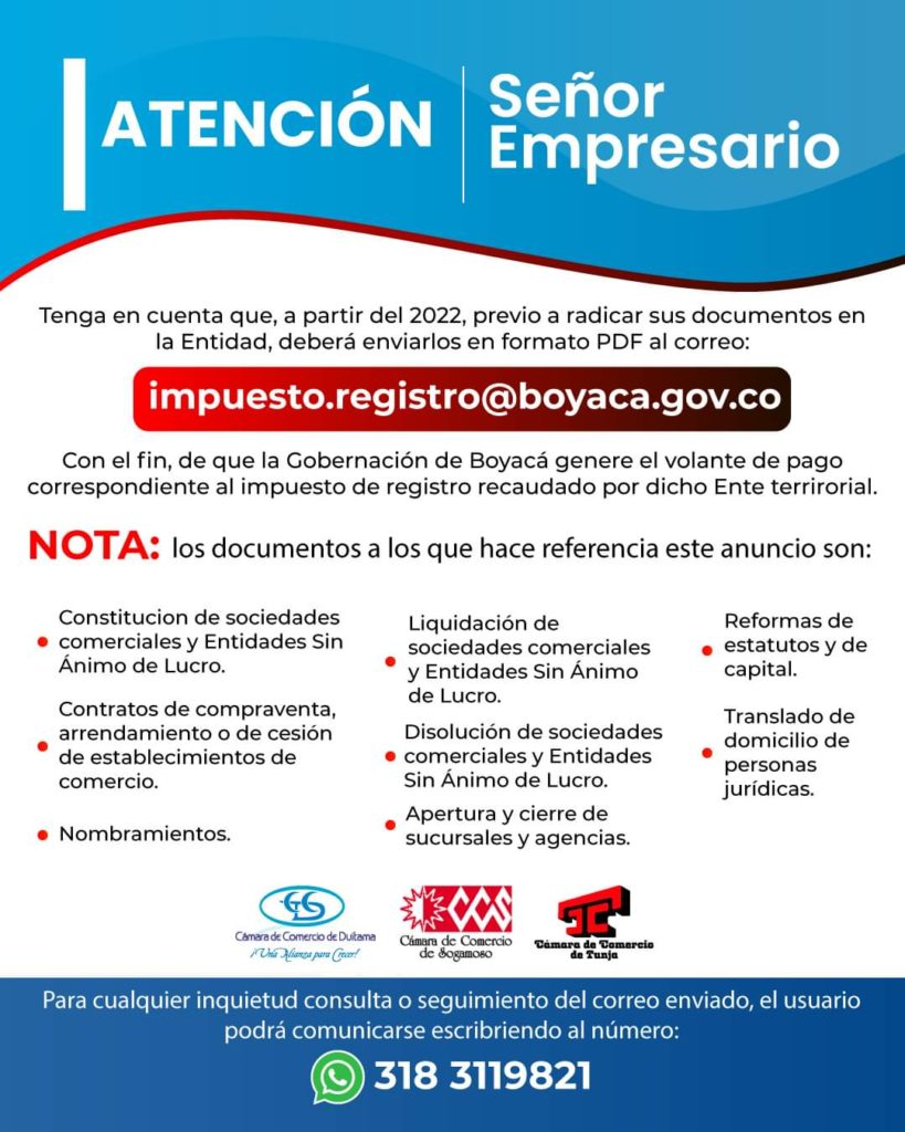 #Atención | 💢Señor empresario, las Cámaras de Comercio de Duitama, Tunja y Sogamoso les informan que a partir del 2022 para el pago del impuesto de registro se debe enviar el documento que se va a radicar en PDF al correo impuesto.registro@boyaca.gov.co , con el fin de que la Gobernación de Boyacá genere el volante […]